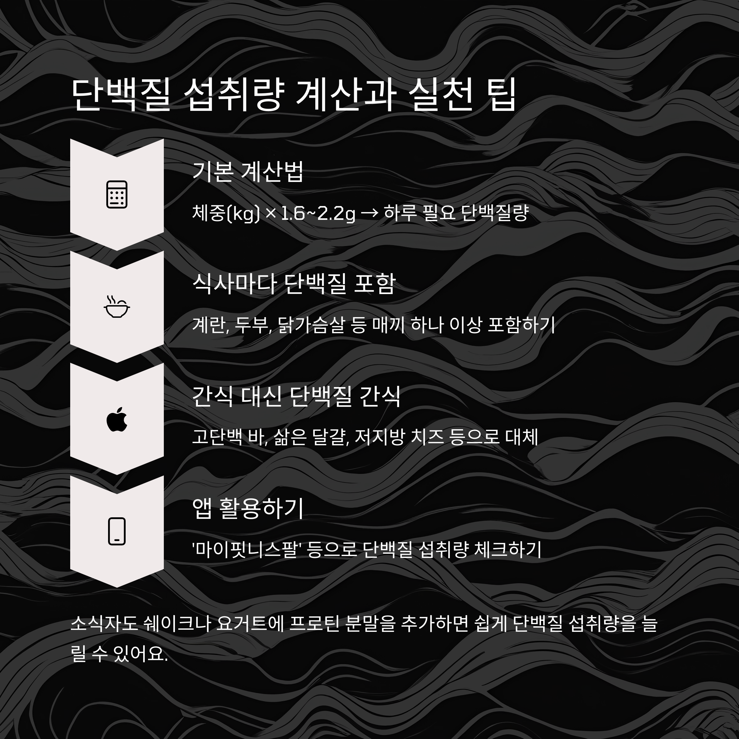 - 앱 활용: ‘마이핏니스팔’ 등으로 단백질 섭취량 체크해보세요
